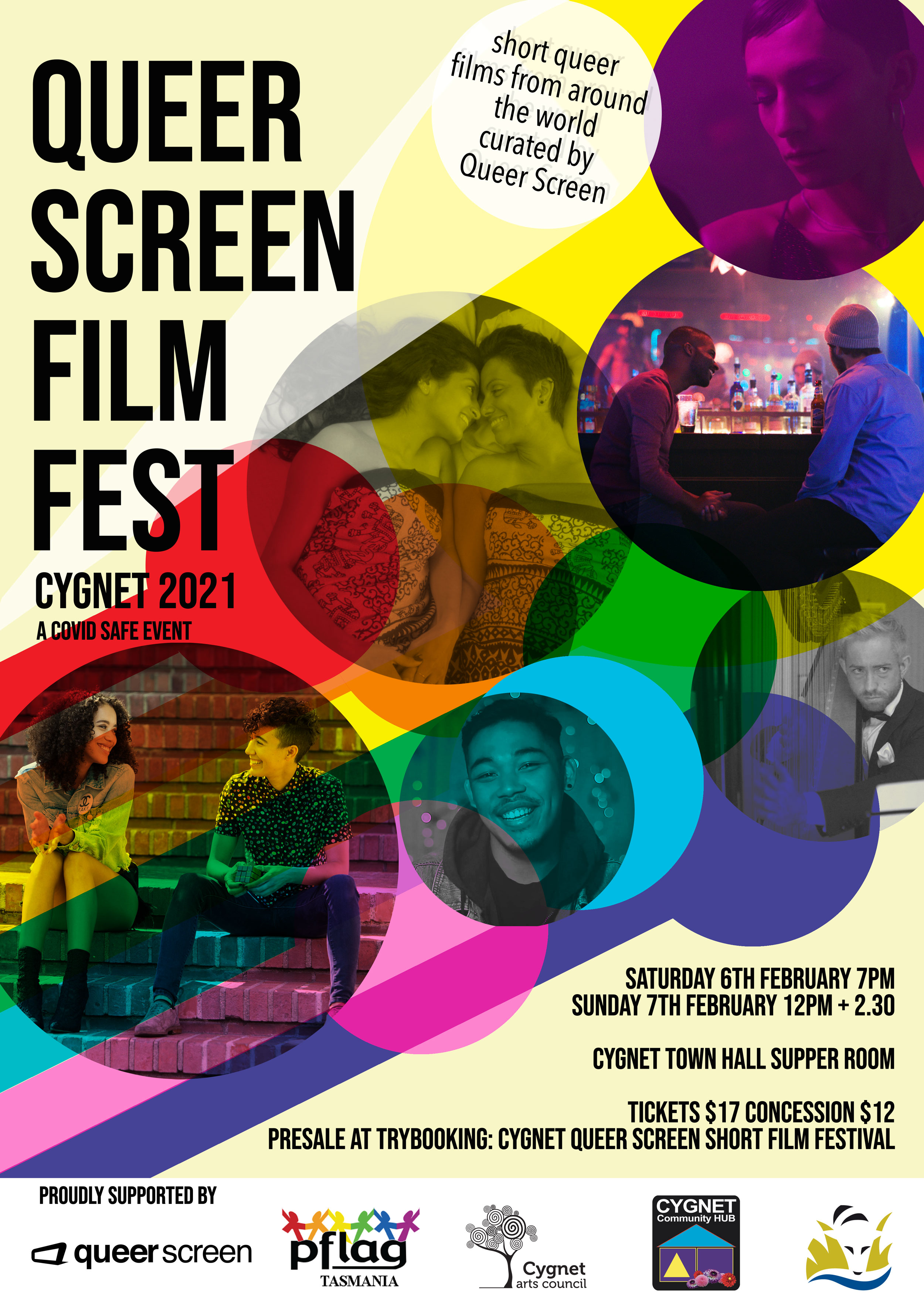 Saturday 6th February 7pm, Sunday 7th Feb 12pm + 2.30pm Cygnet Town Hall Supper Room. Tickets $17 Concession $12 presale at Trybooking:Cygnet Queer Screen Short Film Festival cashless door sales available unless sold out. Presented by PFLAG Tasmania and Cygnet Community arts Council.