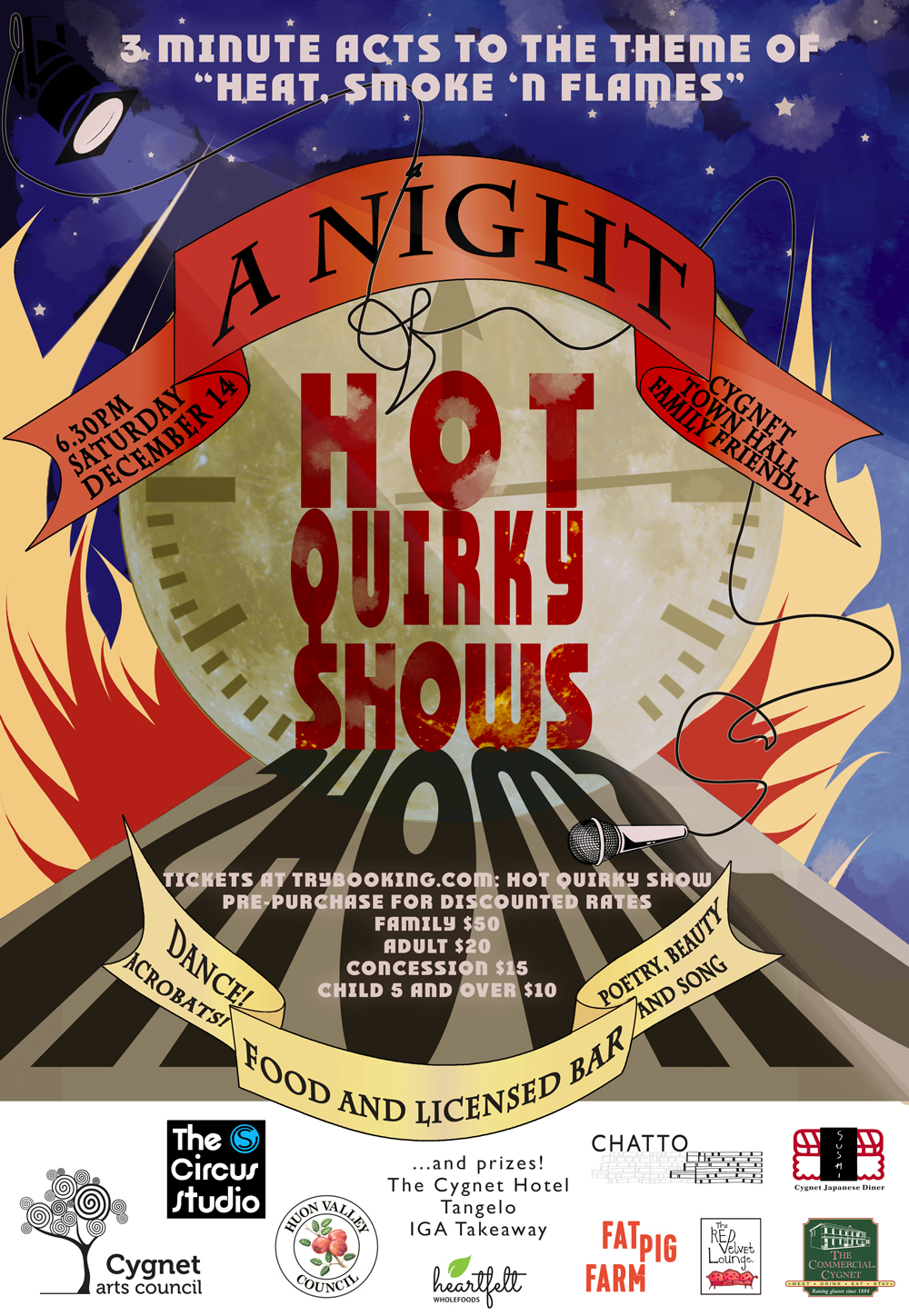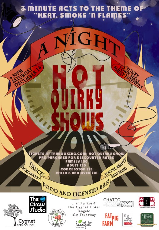 A Night of Hot Quirky Shows 2019 was a community response to the trauma experienced by residents of the Huon Valley during the Bushfires of the previous summer. Short acts ranging from music, to theatre, circus to foley arts were showcased in an evening performance at The Cygnet Town Hall.